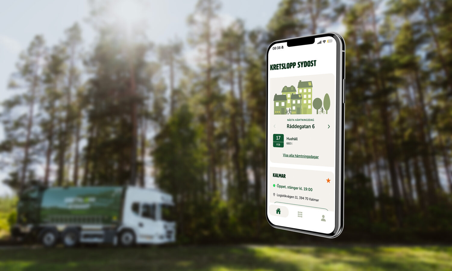 Med Kretslopp Sydost-appen får du påminnelse om sophämtning, öppettider för återvinningscentraler och information om driftstörningar. I appen kan du även hantera abonnemang, fakturor och extra hämtning.